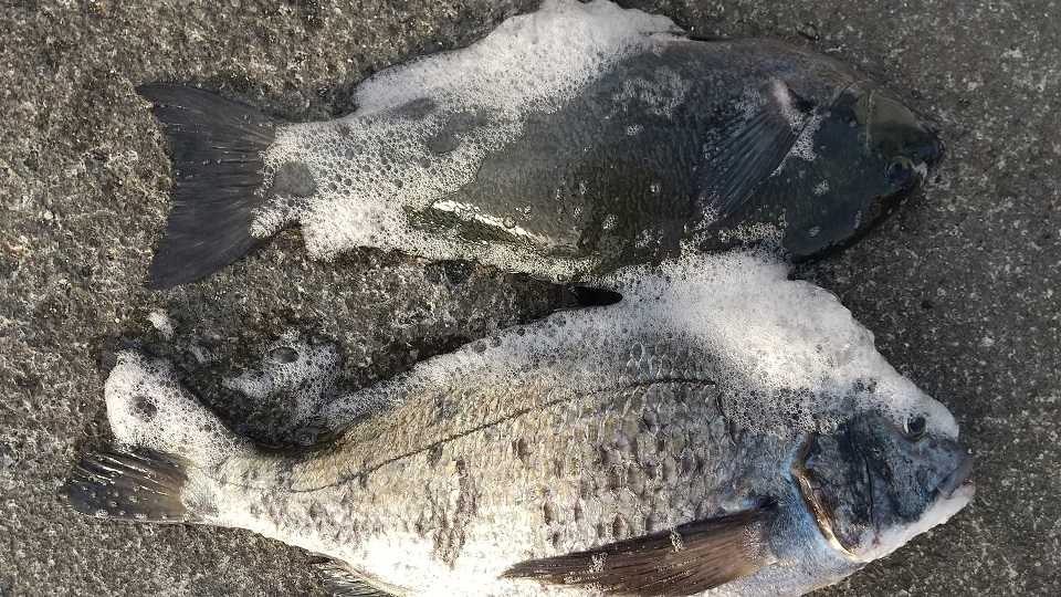 水温 17,0 度 澄み 朝だけ波あり 上り潮メジナ 30〜40cm 15匹 マナイタ 2人