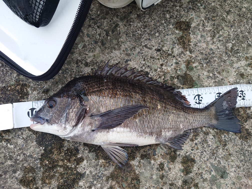 水温 17,4 度 濁り やや波 潮流れずメジナ 34cm 1匹 トンガリ 1人