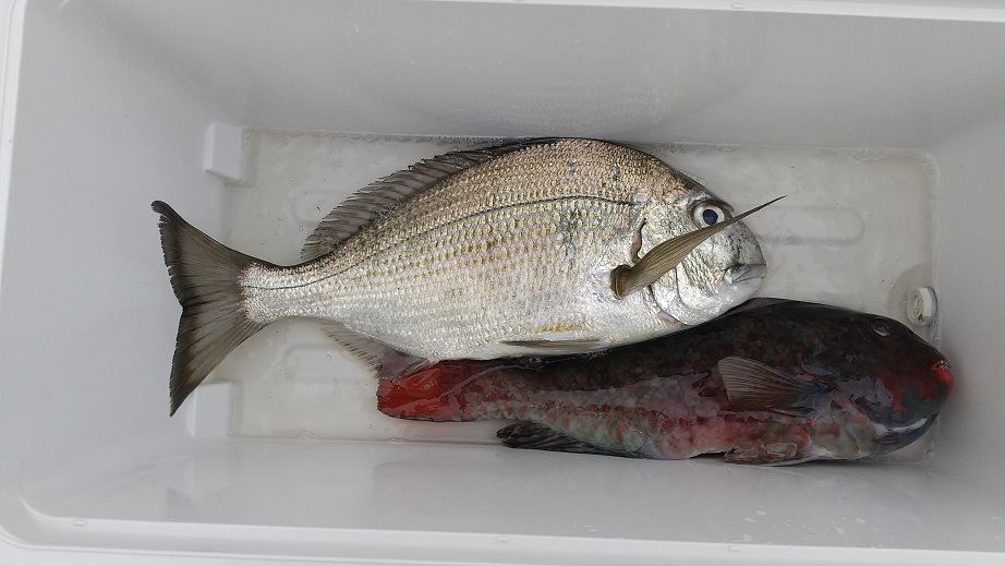 水温 18,6 度 濁り やや波あり 潮流れずヘダイ 42〜44cm 2匹 ハズレドコ 2人