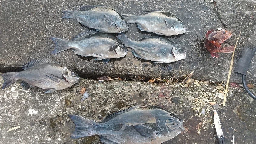 水温 18,0 度 澄み 凪 潮流れずメジナ 30〜42cm 6匹 トーフ 1人
