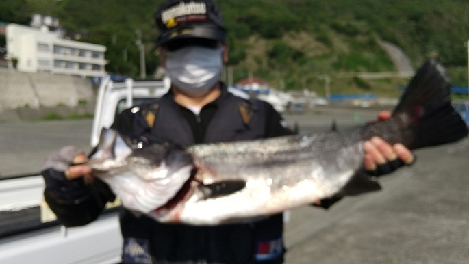 水温 18.9 度 薄濁り やや波あり 潮流れず平スズキ 4,3kg 1匹 丸島 1人