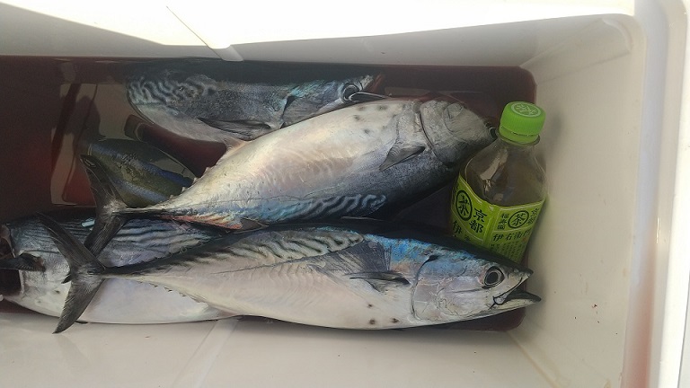 水温 19,0 度 薄濁り 高いウネリ 次第に速い上り潮ヤイトカツオ 45cm級 4匹 マナイタ 3人