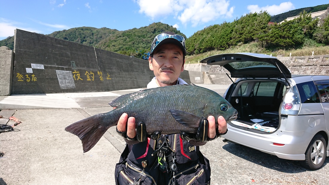 水温 26,4 度 薄濁り ややウネリ 下り潮メジナ 33〜43,5cm 2匹 スズメ 1人